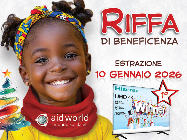 Riffa di Beneficenza 2026 ESTRAZIONE: sabato 10 gennaio 2026Biglietti vincenti continua... Khan Academy: un raggio di luce dove l’istruzione sembra un miraggio È sera in un campo profughi al confine tra Giordania e Siria. Tra le tende, una luce fioca illumina il volto concentrato di Ahmad, 14 anni. Scaricata a singhiozzo grazie a una connessione instabile, sul suo smartphone scorre una lezione di algebra. continua... Jennifer e Josephine Ghana: sostegno per cure riabilitative dei bambini - donazione mensile 9 euro 5 per mille per Aidworld Brasile: sostegno a distanza di un bambino di Curitiba - donazione mensile 30 euro Ghana: sostegno a distanza di un bambino di Akwidaa - donazione mensile 30 euro Romania: sostegno collettivo per bambini disabili - donazione mensile 20 euro Share on Facebook